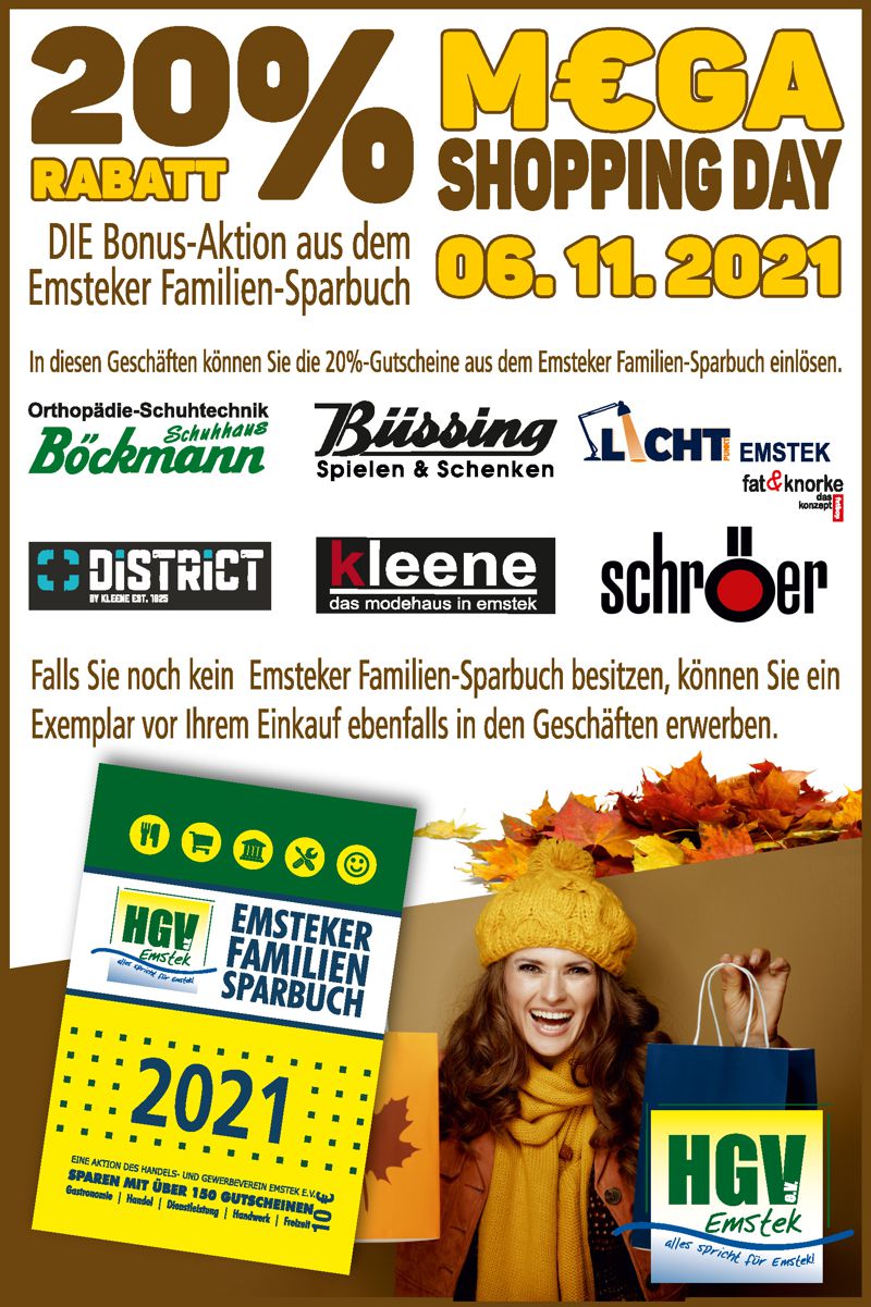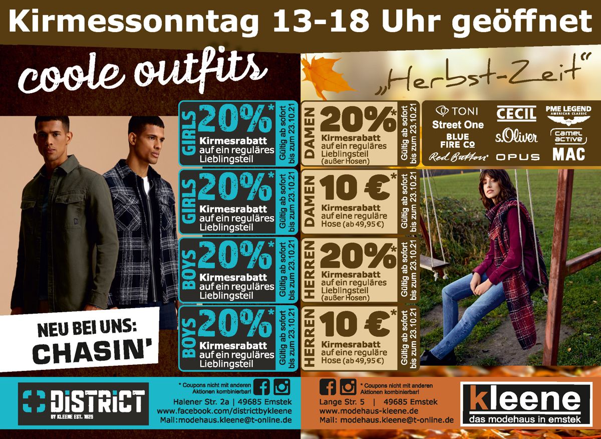 Am Samstag, den 6.11.21 bekommst du bei uns, in Verbindung mit dem EMSTEKER FAMILIENSPARBUCH, 20% RABATT auf deinen gesamten regulären Einkauf im DISTRICT und im MODEHAUS KLEENE !
