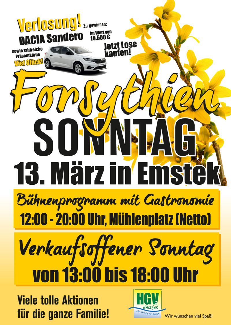 Am 13. März 2022 findet in Emstek wieder der Forsythien-Sonntag, mit jeder Menge Aktionen im ganzen Ort statt.