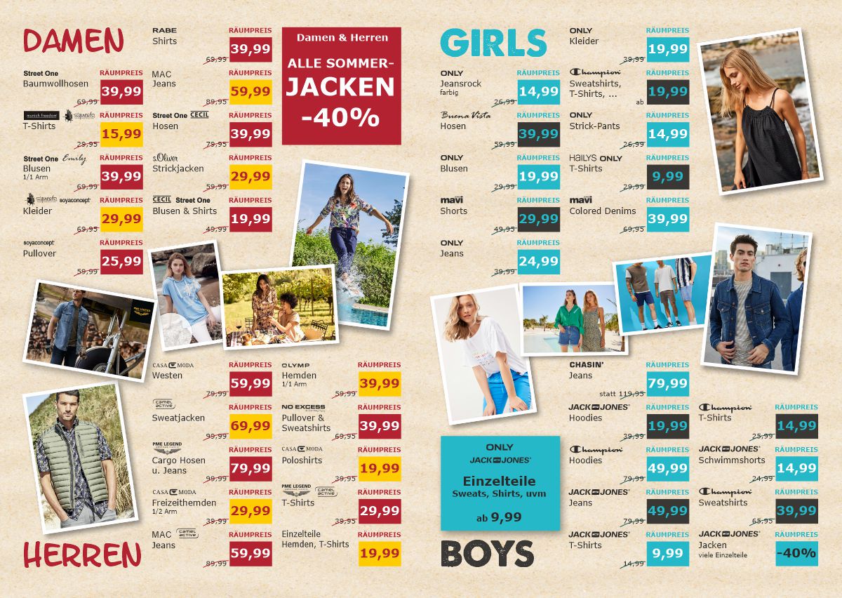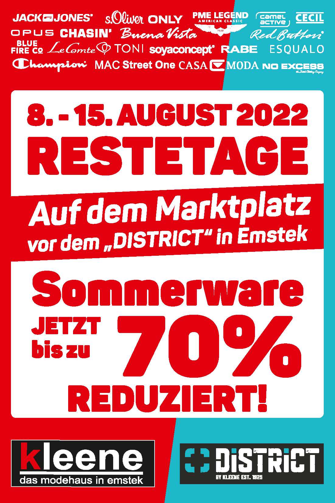 Wir werden vom 8. bis zum 15. August auf dem Marktplatz vor unserem DISTRICT eine Fläche aufbauen wo wir Sommerware aus beiden Geschäften anbieten, die mindestens 50%, und teilweise sogar bis zu 70% reduziert ist!