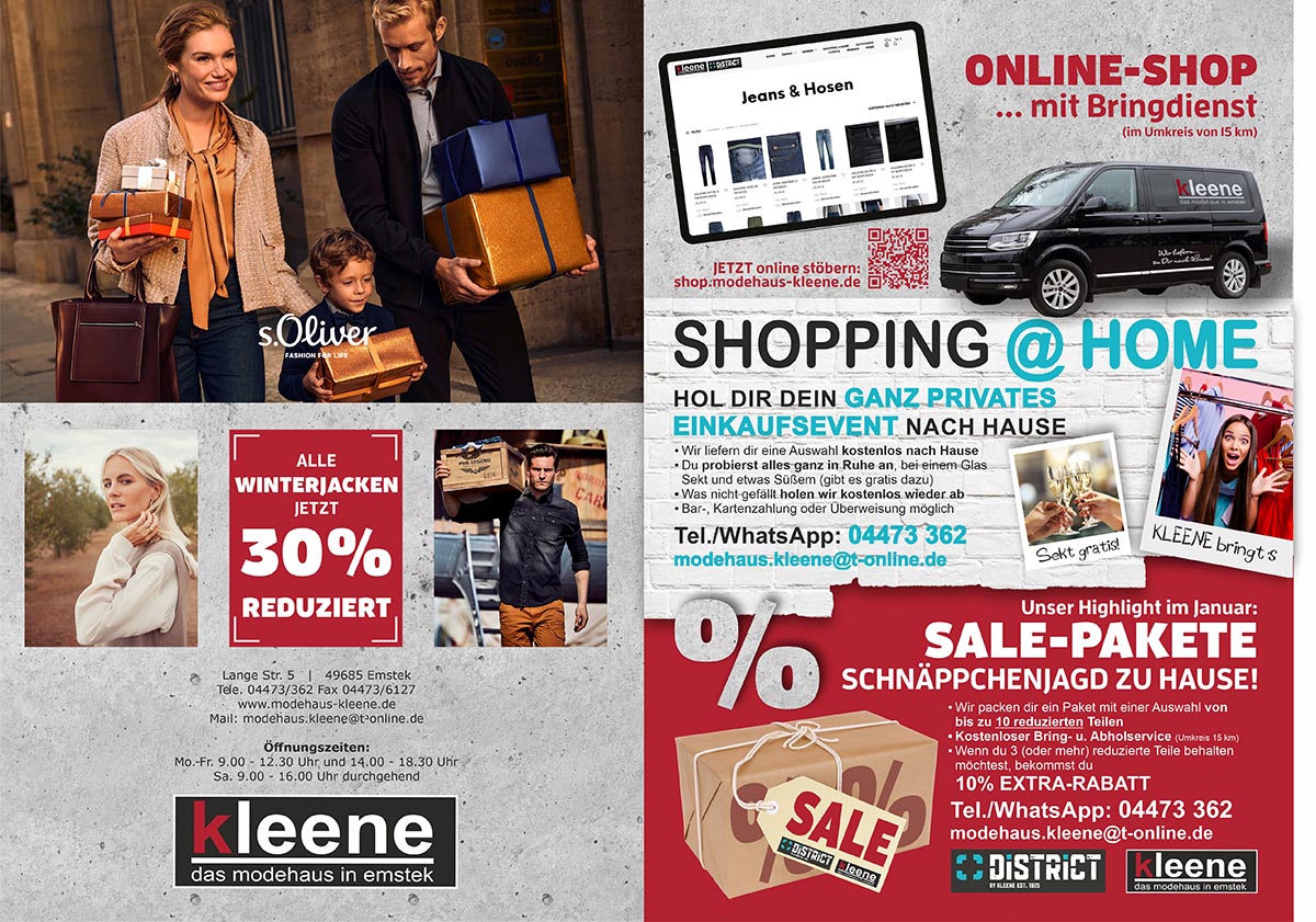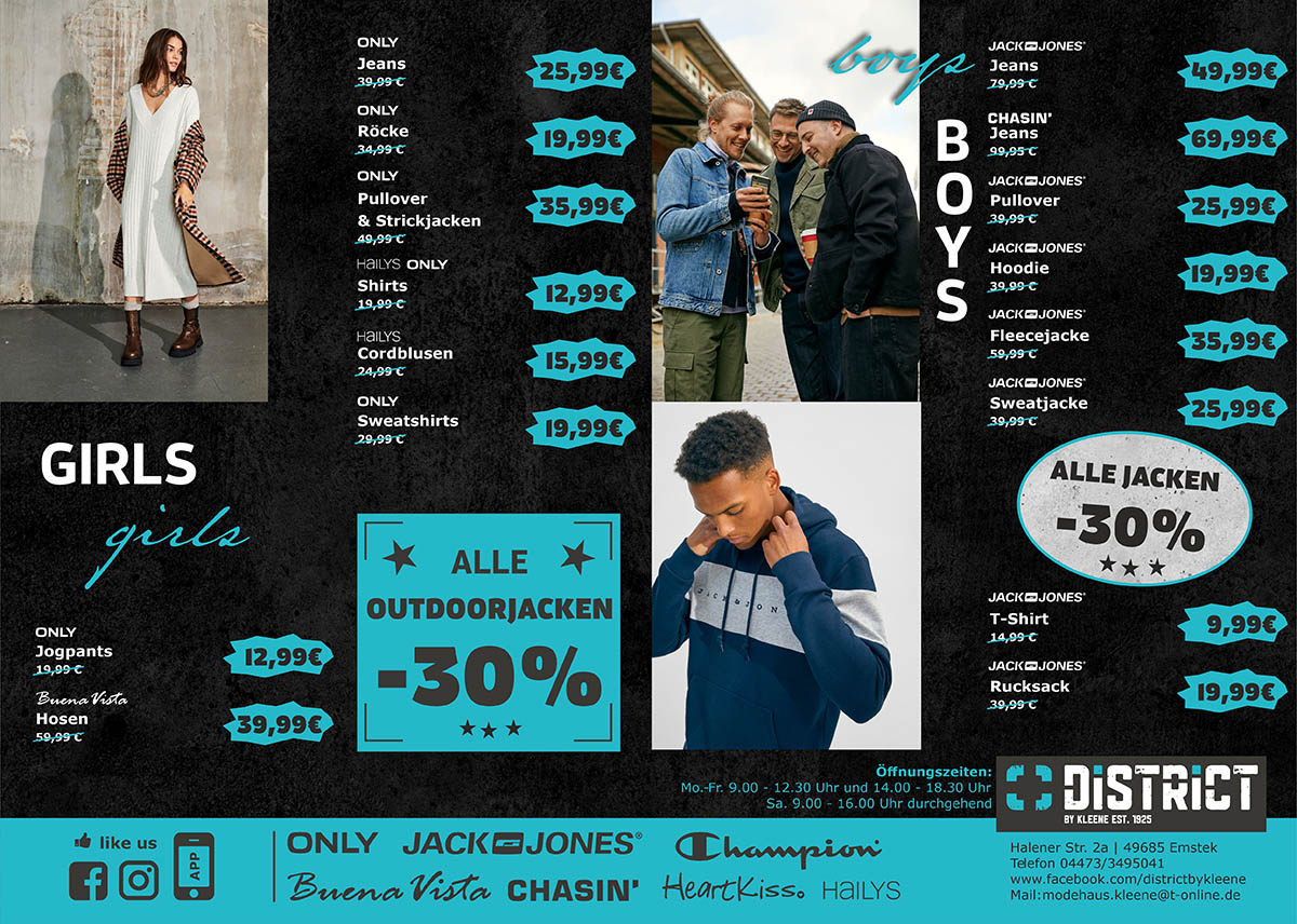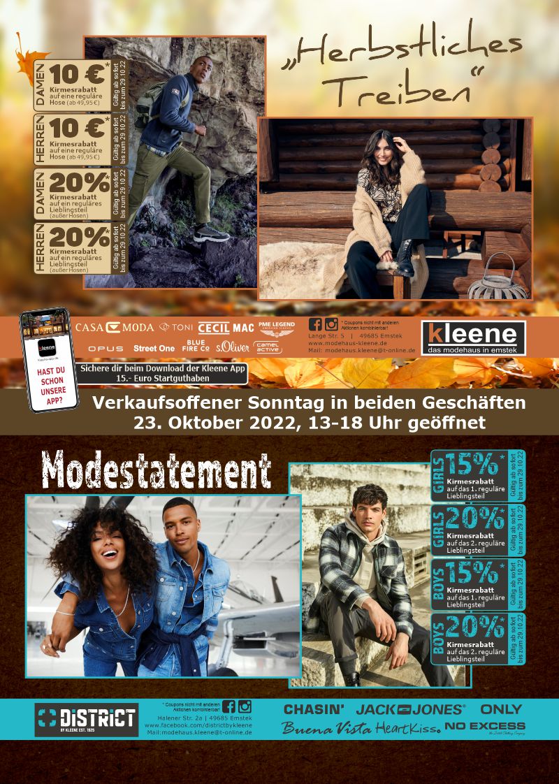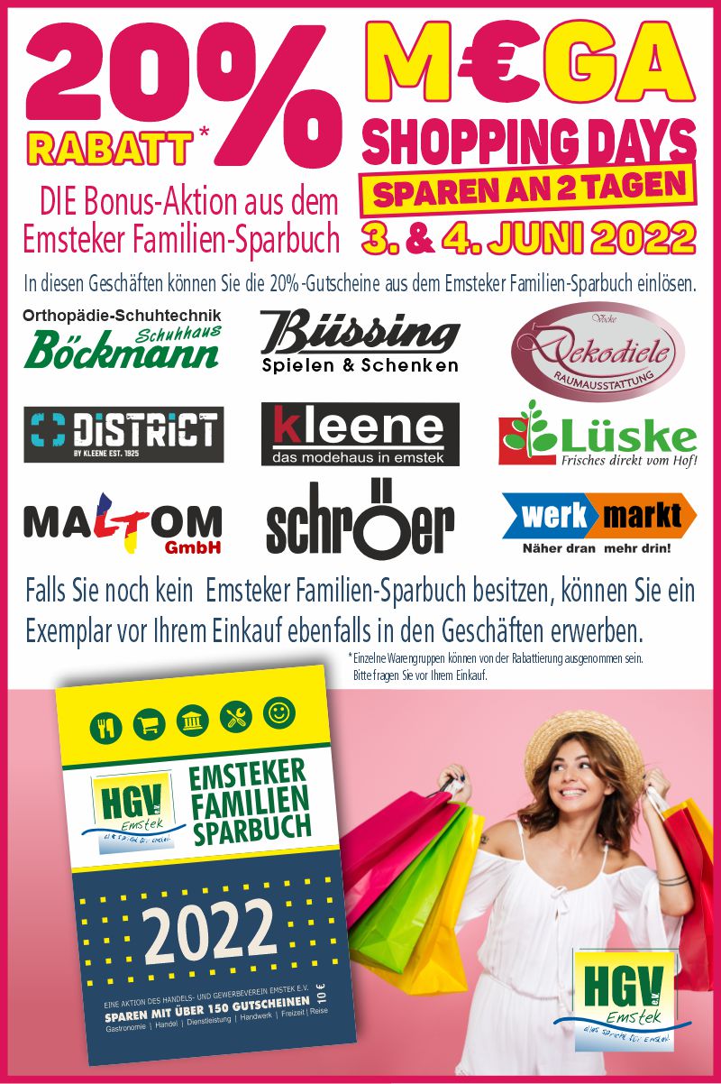 Am 3. & 4. Juni 2022 bekommst du bei uns, in Verbindung mit dem EMSTEKER FAMILIENSPARBUCH, 20% RABATT auf deinen gesamten regulären Einkauf im DISTRICT und im MODEHAUS KLEENE !
