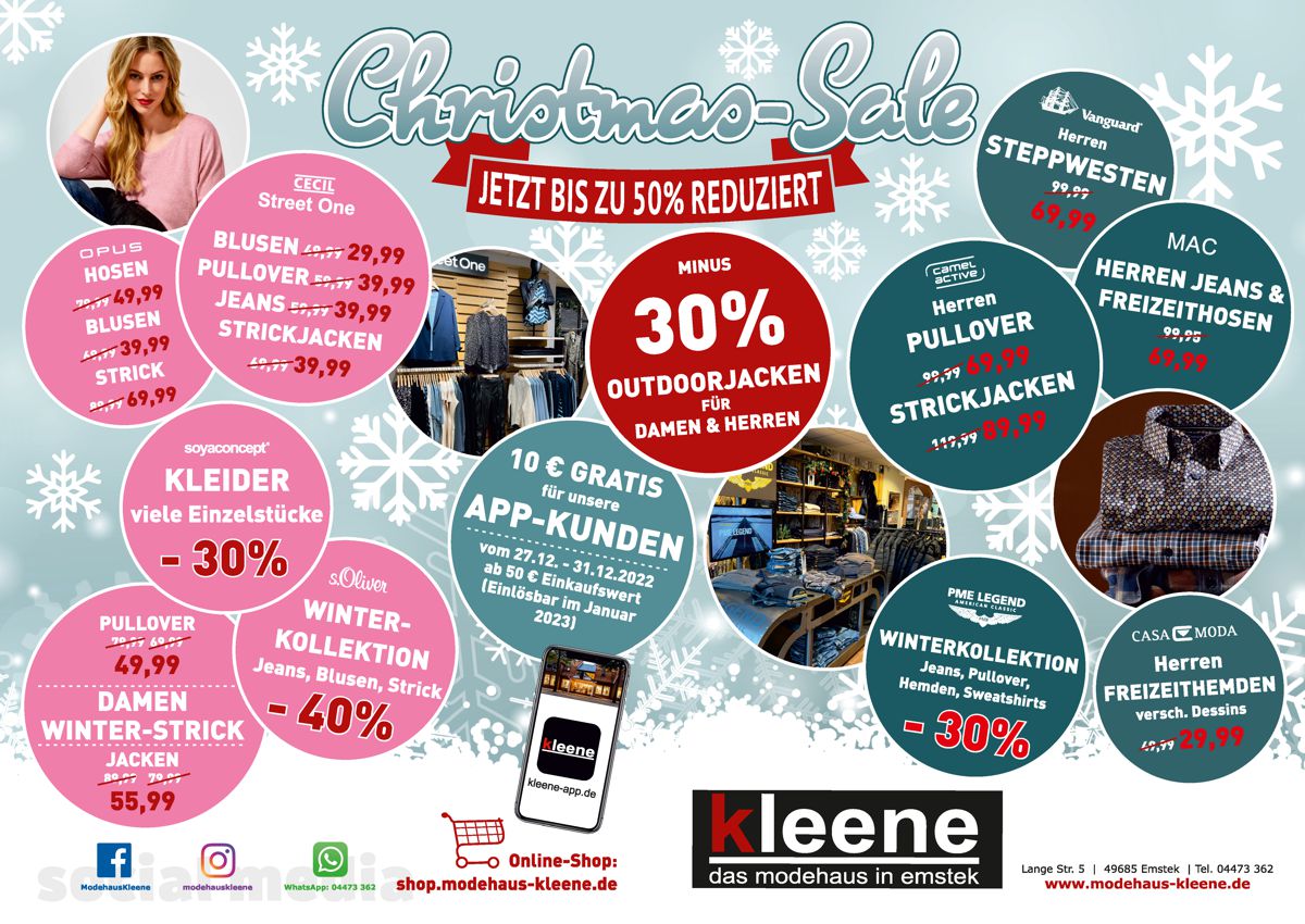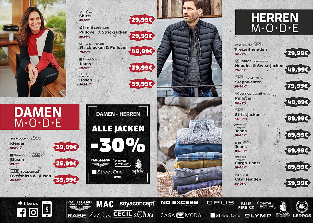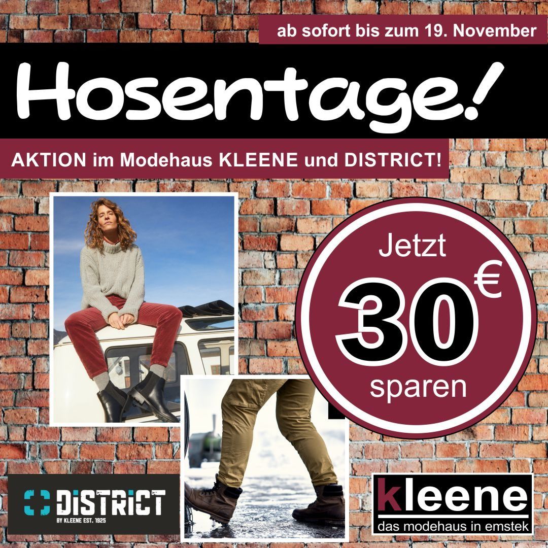 Ab sofort, bis zum 19.11.2022, bekommst du von uns im MODEHAUS KLEENE und im DISTRICT beim Kauf der ersten regulären Hose, ab 49,95€, 10.-€ Rabatt! Und wenn du 2 Hosen ab 49,95€ kaufst, egal ob Damen- oder Herrenhosen, bekommst du nochmal 20 € und sparst somit insgesamt sogar 30.-€! Wenn sich das nicht lohnt?!? ?